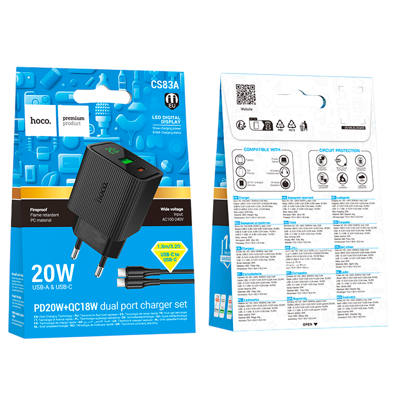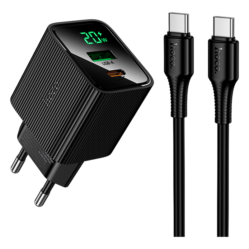 Сетевое З/У HOCO CS83A 1USB+1Type-C 3.0A 20W PD,QC дисплей с кабелем Type-C черный (1/18/180)