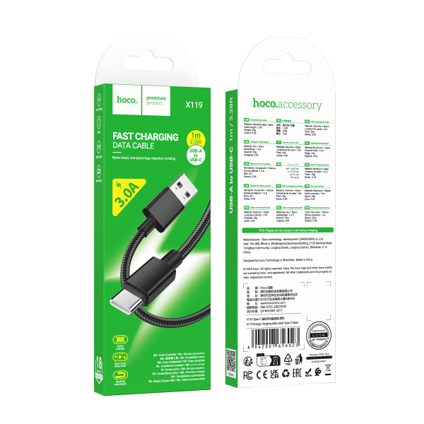 Кабель HOCO X119 USB (m)-Type-C (m) 1м 3.0A нейлон черный (1/420)