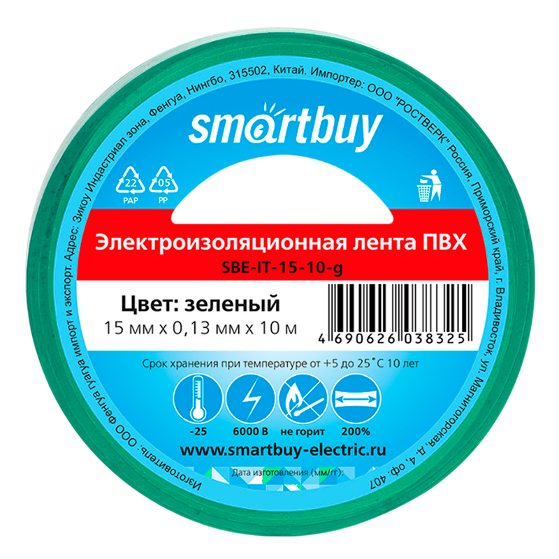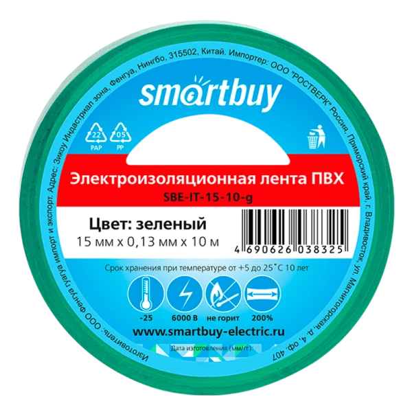 Изолента Smartbuy 15мм*10м ПВХ зеленый