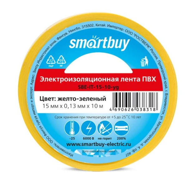 Изолента Smartbuy 15мм*10м ПВХ желтый зеленый