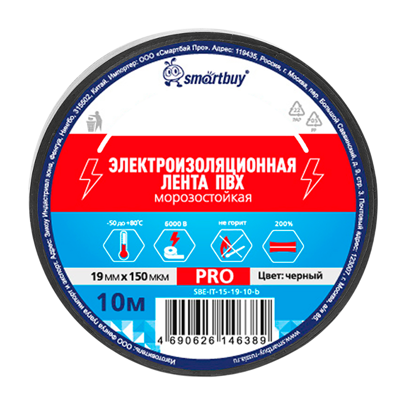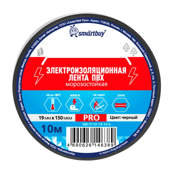 Изолента Smartbuy PRO 19мм*10м ПВХ морозостойкая черный