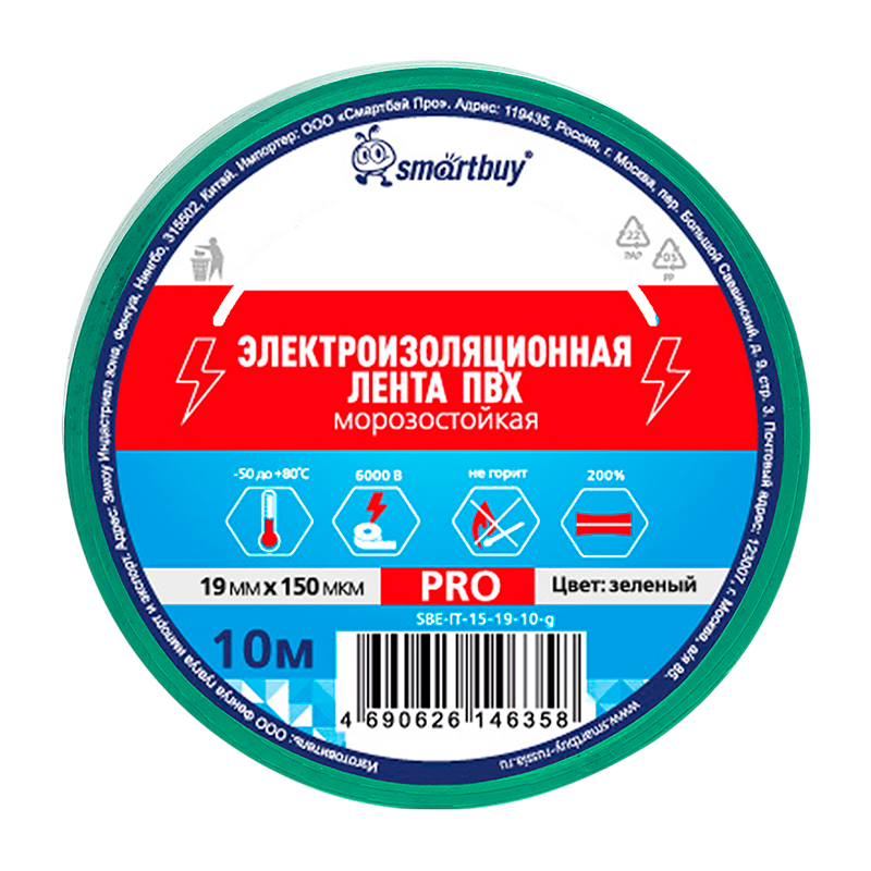 Изолента Smartbuy PRO 19мм*10м ПВХ морозостойкая зеленый