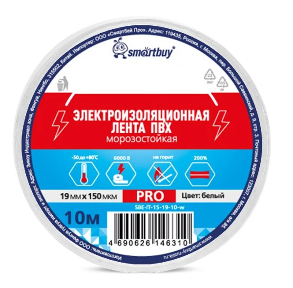 Изолента Smartbuy Pro, 0.15х19мм, 10 метров, белая (SBE-IT-15-19-10-w)