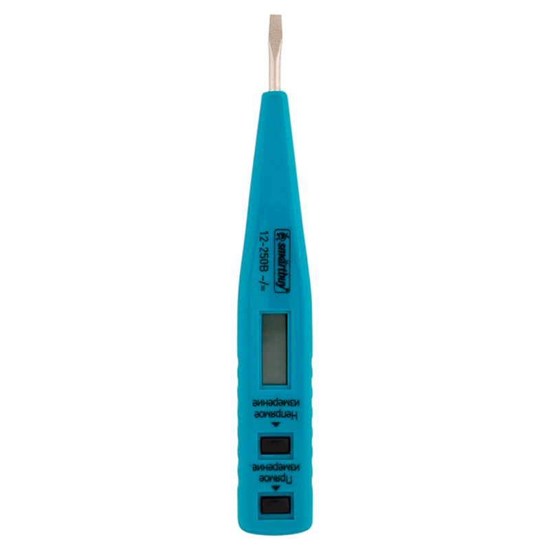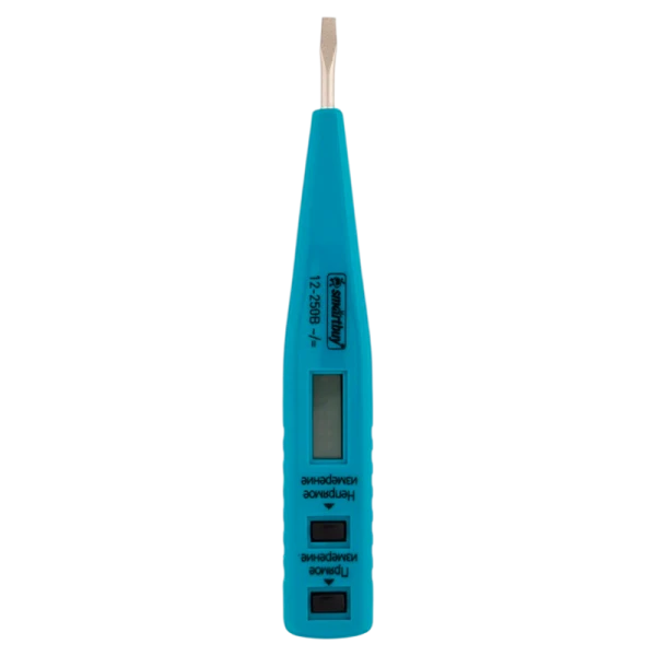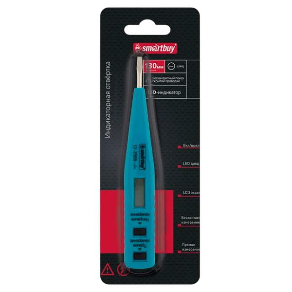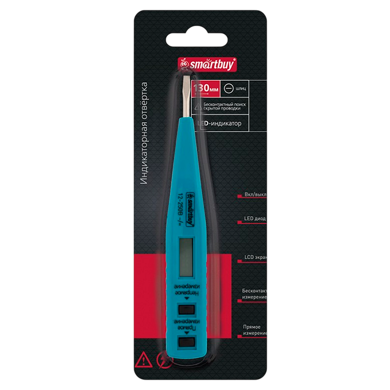 Индикаторная отвертка Smartbuy Tools. Этот ручной инструмент предназначен для определения напряжения в диапазоне от 12 до 220В и оснащен удобным ЖК дисплеем для отображения результатов. Отвертка выполнена в виде шлица, что обеспечивает ее универсальность и практичность в использовании.