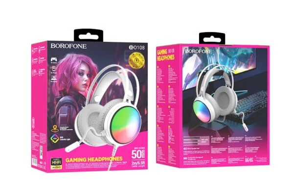 Borofone BO108 — это полноразмерные накладные наушники с микрофоном и эффектной RGB-подсветкой, которые идеально подойдут для погружения в мир игр и развлечений. Вы оснащены 50 мм динамическими драйверами, способными воспроизводить звук в широком диапазоне от 20 Гц до 20 кГц, что обеспечивает насыщенное и детализированное звучание.