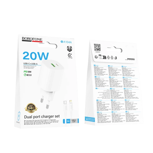 Сетевое З/У Borofone BA104A 1USB+1Type-C 20W QC3.0 с кабелем Lightning/Type-C белый (1/20/120)