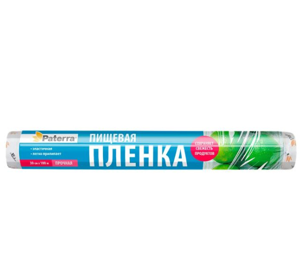 Сохраняет свежесть, необходимую влагу и вкусовые качества продуктов. Пленка PATERRA отлично тянется и прилипает ко всем видам посуды, обеспечивая герметичность упаковки.