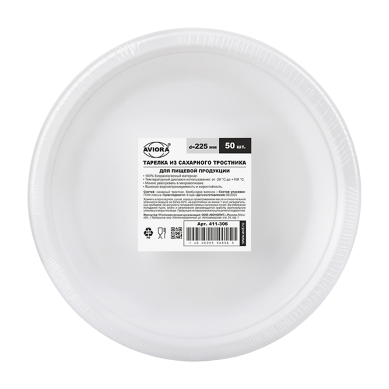 Тарелка одноразовая из сахарного тростника Aviora 225мм обладает высокими жиро- и влагостойкими свойствами, прочная, не токсичная. Просто утилизируется и полностью разлагается в течение 3-6 месяцев. Выдерживает высокие до + 100 ºС и низкие до -20 ºС температуры.