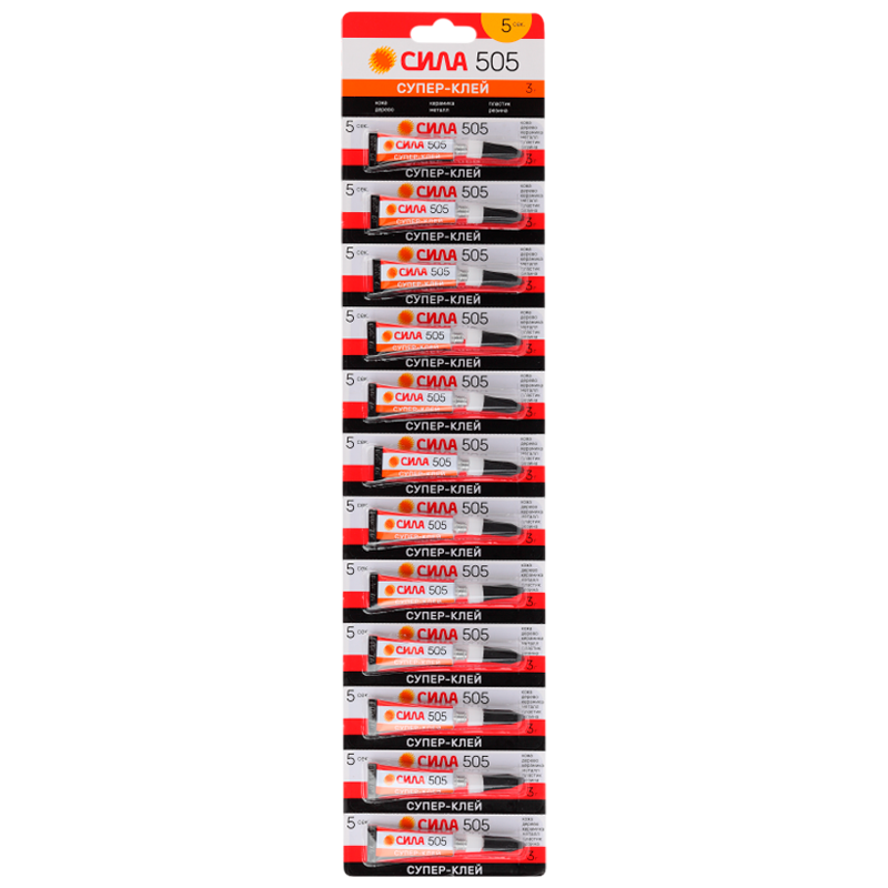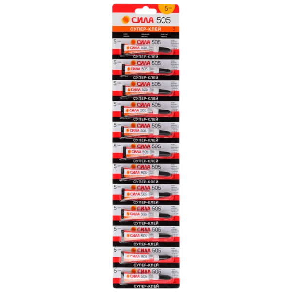 Супер-клей СИЛА 505 на ленте, объединяющей 12 тюбиков по 3 гр. Индивидуальная упаковка каждого тюбика представляет собой отрывной от общей ленты блистер. Супер-клей СИЛА 505 – проверенный клей с отличными свойствами. Обладая высокой концентрацией цианакрилата и хорошей текучестью, он особенно эффективен для склеивания металлических деталей. Успешно применяется для пластика, дерева, кожи, резины, керамики, фарфора.