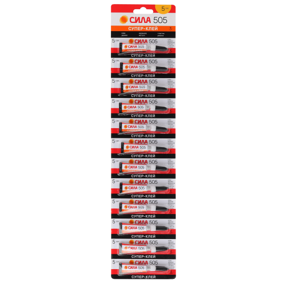 Набор 12 шт. популярного супер-клея СИЛА 505 на ленте, объединяющей 12 тюбиков по 3 гр. Индивидуальная упаковка каждого тюбика представляет собой отрывной от общей ленты блистер. Супер-клей СИЛА 505 – проверенный клей с отличными свойствами. Обладая высокой концентрацией цианакрилата и хорошей текучестью, он особенно эффективен для склеивания металлических деталей. Успешно применяется для пластика, дерева, кожи, резины, керамики, фарфора. Экономично расходуется и застывает за 5 секунд. Высококачественный супер-клей по доступной цене.