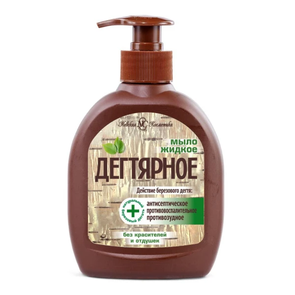 Жидкое мыло с натуральным березовым дегтем подходит для очищения проблемной кожи. Не содержит красителей, отдушек, парабенов, силиконов, не раздражает кожу, клинически протестировано, имеет естественный рН. Можно использовать в качестве геля для душа. Натуральный березовый деготь- природный антисептик, регулирует деятельность сальных желез, устраняет зуд и оказывает противовоспалительное действие.