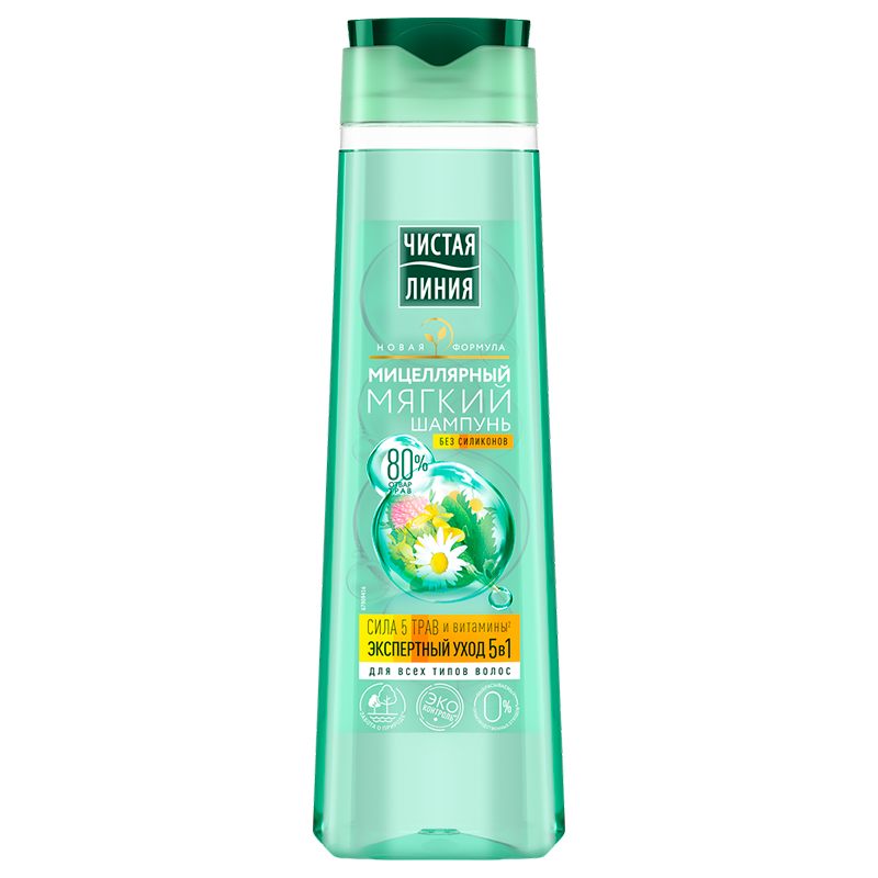 Шампунь Чистая линия Мицеллярный для всех типов волос «Экспертный уход 5в1 Сила 5 трав» не раздражает чувствительную кожу головы, сохраняет ее гидролипидный баланс и не пересушивает волосы даже при ежедневном мытье. Мицеллярная основа шампуня Чистая Линия бережно очищает и увлажняет волосы и кожу головы.