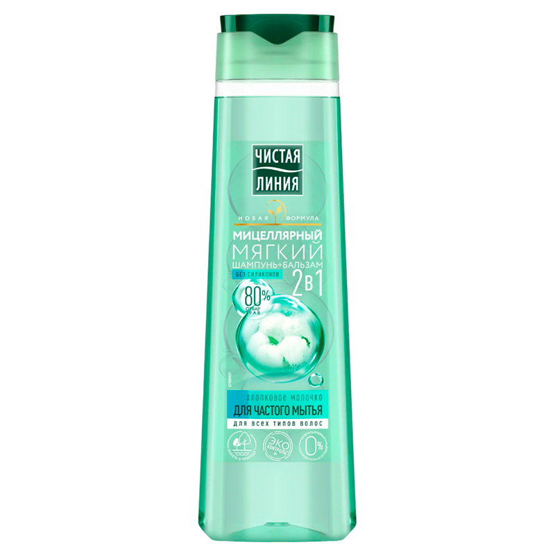 Мицеллярная основа бережно очищает. Хлопковое молочко ухаживает за волосами, смягчает и облегчает расчесывание. 80% отвара целебных трав наполняет волосы блеском и силой. Благодаря низкосульфатной формуле мицеллярный шампунь Чистая линия 2в1 не раздражает чувствительную кожу головы и подходит для ежедневного применения.