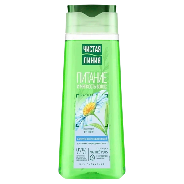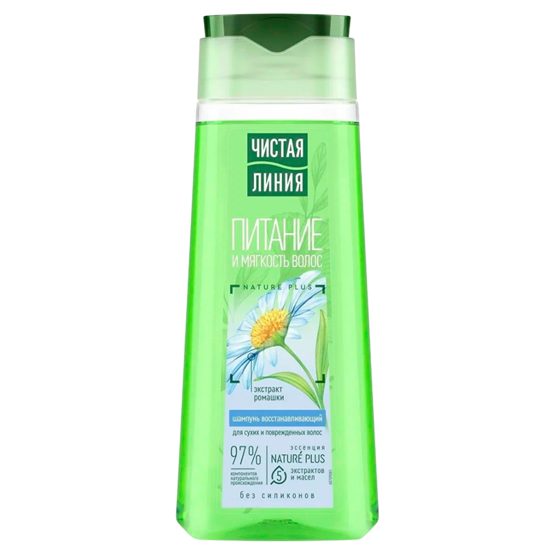 Шампунь Чистая линия Восстанавливающий на отваре целебных трав с экстрактом ромашки для сухих и поврежденных волос. Шампунь на 97% состоит из компонентов натурального происхождения. Эссенция Нейче Плюс содержит 5 экстрактов и масел (экстракты вербены, шалфея, шиповника, масло миндаля и льна). Тщательно отобранные по своим ключевым свойствам активные натуральные компоненты предупреждают выпадение, питают и защищают волосы от повреждений.