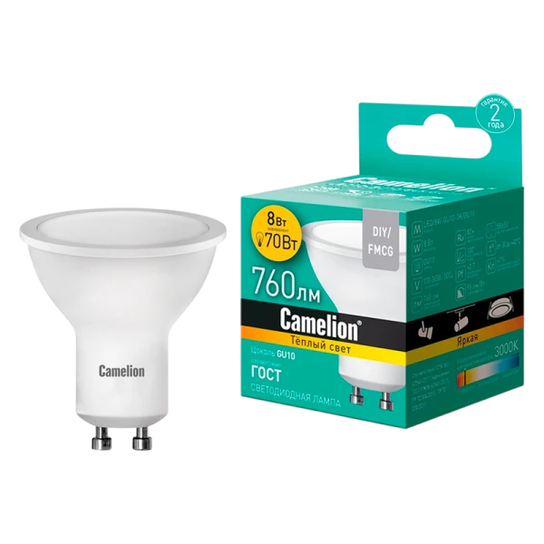 Лампа светодиодная Camelion GU10 8W 3000К 220V софит матовая (1/5/100)