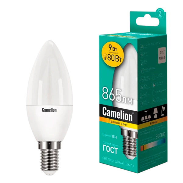 Лампа светодиодная Camelion C35 E14 9W 3000К 220V свеча матовая (1/10/100)