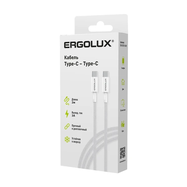 Кабель Ergolux ELX-CDC13 Type-C (m)-Type-C (m) 2м 3.0A белый (1/10/240)
