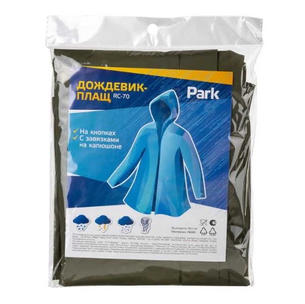 Дождевик «Плащ» RC-70 плотность 70 гр. На кнопках Материал: ПЕВА Упаковка: ПЭ пакет (подвесной) с вкладышем Тощина 0,17мм (170мкм)