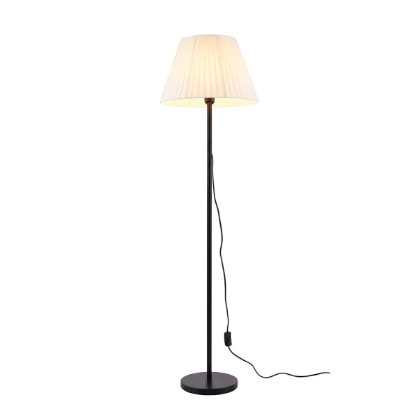 Торшер с текстильным абажуром прекрасно подойдет для классических и современных интерьеров. Благодаря абажуру в форме конуса напольный светильник создает мягкое равномерное свечение, комфортное для глаз. Торшер идеально подойдет тем, кто ценит красоту простоты и лаконичности форм. Светильник подходит для освещения различных комнат: спальни, гостиной, кухни, зала или прихожей и станет дополнением к вашему интерьеру, обеспечивая мягкий свет и уютное настроение. Использование линейного дизайна позволяет визуально увеличить пространство вашей квартиры или дома. Металлическая стойка светильника крепится к прочному основанию и обеспечивает устойчивость. Подставка торшера устойчива на любом типе пола. Клавиша включения расположена на проводе в нижней части светильника. В качестве источника света подойдут лампы с цоколем E27. Можете использовать энергосберегающшие, светодиодные, декоративные лампы накаливания. Мощность лампы не должна превышать 40Вт.
